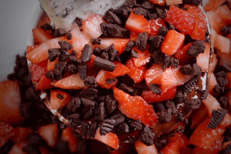 Picolé de Cookies &Cream Magnum Kibon, Creme de Chocolate, Farofa de Biscoito Oreo e Morango Picado.